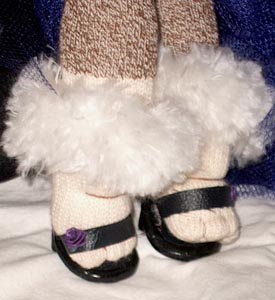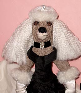 Audrey is completely handmade, from my own original design. Her body is made from the classic Rockford red heel socks used for sock monkey dolls. Her hair is made from yarn. Her black satin dress has a velvety floral pattern overall. Her gloves are white satin. She has a purple tulle slip on under her gown, and her shoes are made from painted polymer clay and black vinyl, with purple ribbon roses on each. She is wearing a black satin choker with a large faux pearl surrounded by rhinestones, and a rhinestone tiara. Her bracelet is of faux pearls and her “ring” is a rhinestone button. She is carrying a matching handbag (not pictured). Audrey’s eyes and nose are made of felt and hand-painted. Audrey has sculpted features - hands, feet, and mouth and she stands 25" from topknot to toes. She is made from the largest size socks available, and is the tallest doll I can make. |