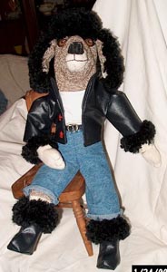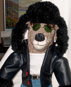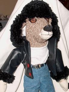 Eddie is completely handmade, from my own original design. The body is made from the classic Rockford red heel socks used for sock monkey dolls. His hair is made from yarn. His jacket is black vinyl, with plastic buttons. His t-shirt is...well, t-shirt material and his jeans are made from an old pair of jeans. His belt is vinyl, as well. The boots shown in the photos are black vinyl, but might be changed if I can reconfigure the pattern to look more like real boots. Eddie's eyes and nose are made of felt and hand-painted. Eddie has sculpted features - hands, feet, and mouth and he stands 21" from topknot to toes. *The sunglasses are not handmade. However, they do fit his personality, and Eddie doesn't like to be without them.  |