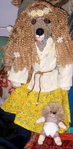 GranolaGranola rubs her eyes and pulls her teddy bear close. It’s time for her nap. She snuggles up against her mother’s breast and yawns. She loves the way her mommy smells. So different to her daddy's smell - but she loves him too and the way he can make her smile by just being there. Granola is wearing a felt diaper, held on with safety pins. She’s also wearing only one sock. She hates socks and pulls them off whenever possible. Her body is stuffed with polyester fiberfill. Her noss and hand-painted eyes are made from felt. She has sculpted features - mouth, hands and feet. Granola measures 6 ½“ (she can‘t walk yet but she‘s starting to pull herself up into a standing position). Granola comes with her mother and a diaper bag containing 3 felt diapers and two shirts. They also have their brightly colored blanket (Granola cries when Moon Flower forgets it), a ball*, some spool-shaped blocks and Granola’s favorite teddy bear.  These are not "play-with" sorts of dolls - the clothing is not made to be removed and the doll may have small objects that could harm a child. They are collectibles. They come with a certificate of authenticity signed and dated by me.  |