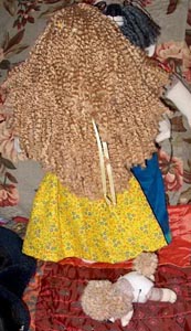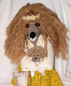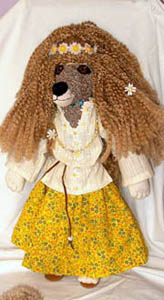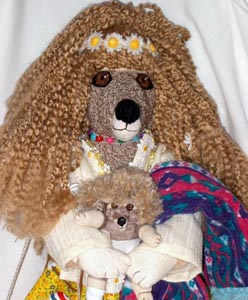 Moon Flower and Granola are completely handmade, from my own original design. Moon Flower’s body is made from the classic Rockford red heel socks used for sock monkey dolls. Granola is made from a child’s size knock-off sock, similar in style and color but of a thinner knit. Their hair is made from yarn. Moon Flower also has fake fur around her ankles and wrists - she’s not fond of poofy bracelets now that she has a baby. Her skirt is cotton/poly blend and her blouse is gauze, adorned with pre-made daisy appliques. Her sandals are hand made from tan leather and suede. Her belt is a leather thong adorned with plastic hearts. In her hair is a crown of cloth daisies tied with yellow ribbon. She has on a beaded choker and a string of yellow beads given to her by a friend from the commune. (Beneath her dress, she wears very feminine lacy panties because she hasn’t quite given up everything from her old lifestyle!) Granola is wearing a felt diaper, held on with safety pins. She’s also wearing only one sock. She hates socks and pulls them off whenever possible. The bodies are stuffed with polyester fiberfill. Their noses and hand-painted eyes are made from felt. They have sculpted features - mouth, hands and feet. Moon Flower stands 21" from her topknot to her toes, while Granola measures 6 ½“ (she can‘t walk yet but she‘s starting to pull herself up into a standing position). Moon Flower and Granola come with a diaper bag containing 3 felt diapers and two shirts for Granola. They also have their brightly colored blanket (Granola cries when Moon Flower forgets it), a ball*, some spool-shaped blocks and Granola’s favorite teddy bear.  |