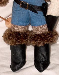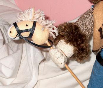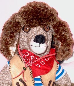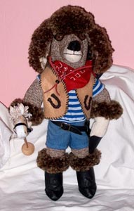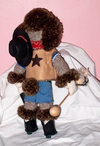 ZacharyEven at four years of age, Zachary knows exactly what he wants to be when he grows up. He is going to be a cowboy. Not just any cowboy, but one with the biggest spread in the west. He’s going to have more cattle than any other cowboy, and he’s going to ride the fastest, bestest horse there ever was. His horse’s name is going to be Lightning and nobody will be able to ride him except Zachary. Not even his stupid sister. For his birthday, his mom and dad gave him the cowboy set he asked for. He never takes it off (well, sometimes he does). He wears his hat all the time, and he loves to show off his vest and bandana. Best of all, he loves his real cowboy boots, just like a grown-up’s only littler. He loves his real gun belt and holster, too. He loves his six-shooter cap gun, but he can’t find it because his stupid sister hid it after he shot her over and over again. If he didn’t have cattle to tend on his stick horse, Little Lightning, he’d go into her room and dig around in her toy box to see if he can find his gun, but he’s just got too much to do and Little Lightning wants to go out for a gallop. Yep. Zachary is going to be a great cowboy when he grows up. Zachary is completely handmade, from my own original design. His body is made from the classic Rockford red heel socks used for sock monkey dolls. His hair is made from yarn. He is wearing blue cotton poly shorts an a blue & white striped cotton knit t-shirt. His vest is made of felt, as is his (pre-made) hat, which also has a leather chin strap. His bandana is a real one, cut down to fit his small size. His boots and gun belt & holster are made from real leather and hand-stitched together. Zachary’s eyes and nose are made of felt and hand-painted. Zachary has sculpted features - hands, feet, and mouth and he stands just 17" from topknot to toes. He is made from the smallest size socks. Zachary is not a "play-with" sort of doll - his clothing is not made to be removed. He's a collectible, and expects to be respected like a real cowboy would be!  |